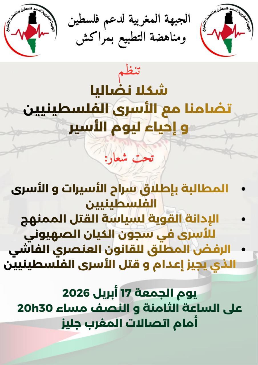 أعلنت الجبهة المغربية لدعم فلسطين ومناهضة التطبيع بمراكش عن تنظيم شكل نضالي تضامني مع الأسرى الفلسطينيين، وذلك تخليدا لليوم العالمي للأسير.